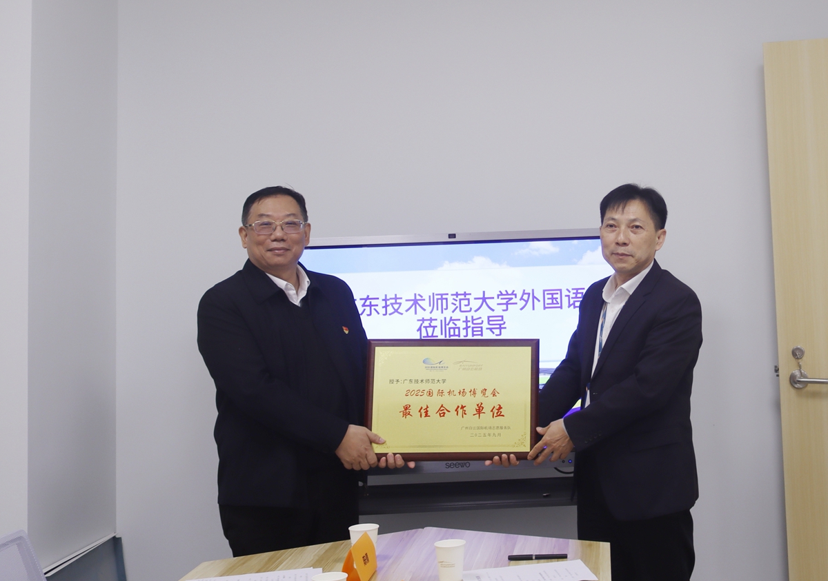 会上举行授牌仪式,李祖文代表白云机场向外国语学院授予“2025国际机场博览会最佳合作单位”牌匾。