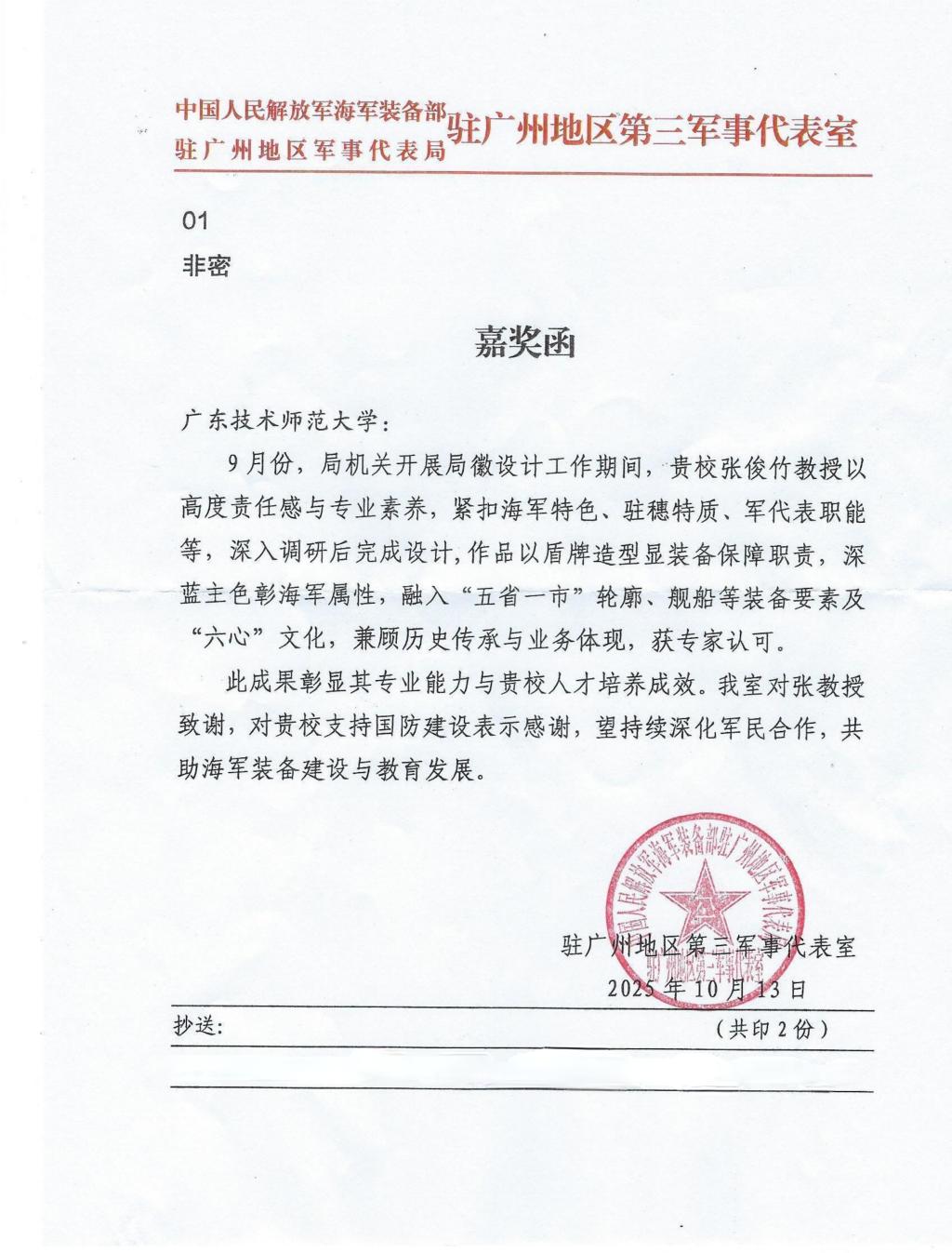 近日,中国人民解放军海军装备部驻广州地区第三军事代表局向广东技术师范大学发来嘉奖函,函中高度肯定我校美术学院张俊竹教授在局徽设计工作中的突出贡献,对其专业能力与责任担当致以诚挚谢意。
