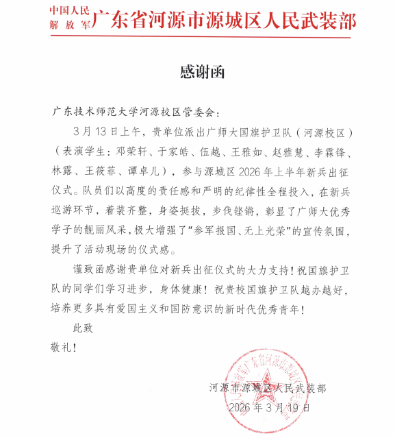 近日,河源市源城区人民武装部向我校河源校区管委会发来感谢函,对我校国旗护卫队(河源校区)参与2026年源城区新兵出征仪式表示衷心感谢,对队员们过硬的素养和昂扬的风貌给予高度肯定。